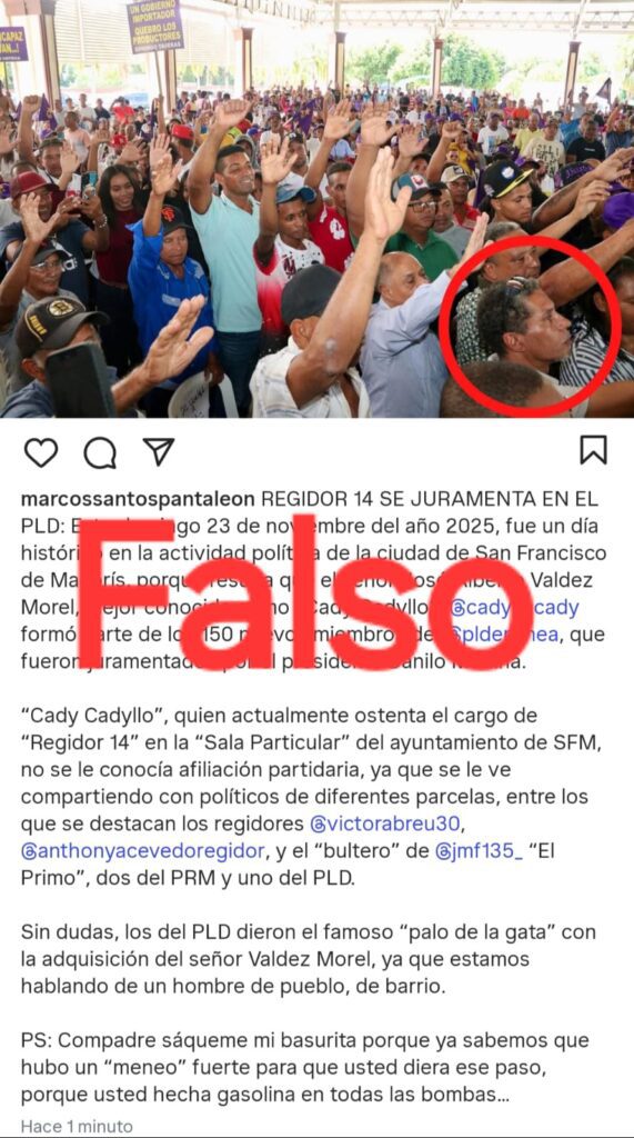 San Francisco de Macorís/ Jose Valdez Tras la circulación en redes sociales de una publicación que intenta atribuirle una afiliación partidaria y una supuesta juramentación en un acto del Partido de la Liberación Dominicana (PLD), el comunicador y camarógrafo José Alberto Valdez Morel, conocido popularmente como Cady Cadyllo, aclaró de manera categórica que dicha información es totalmente falsa.