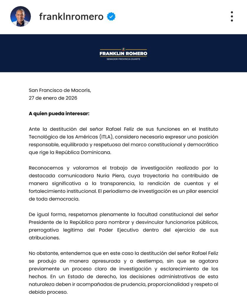 El senador de la República por la provincia Duarte, Franklin Romero, fijó posición pública este martes en torno a la destitución del señor Rafael Feliz de sus funciones en el Instituto Tecnológico de las Américas (ITLA), a través de una carta abierta en la que aboga por la prudencia institucional, el respeto al debido proceso y la presunción de inocencia.